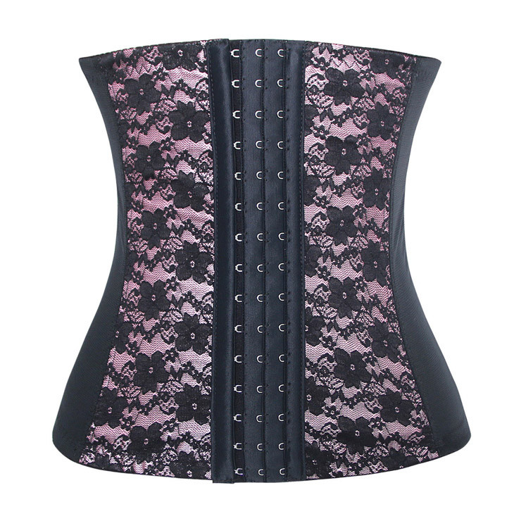 Pink and black lace waist trainer with 9 steel boning panels and 3 sets of hook and eye front closure settings.