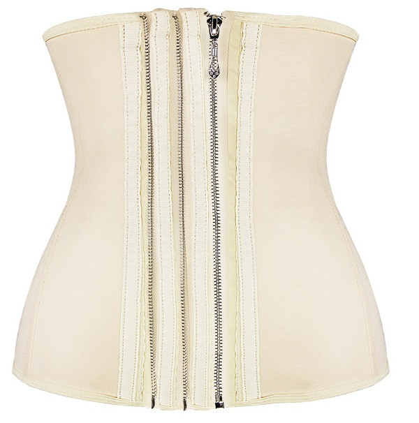 Latex waist training cincher with triple zipper closure and spiral steel boning throughout.