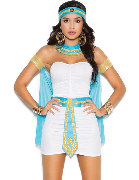Queen of the Nile - 5 pc. costume includes bandeau mini dress, neck piece, head piece, belt and arm bands with attached cape. (Shoes and jewelry not included.)
