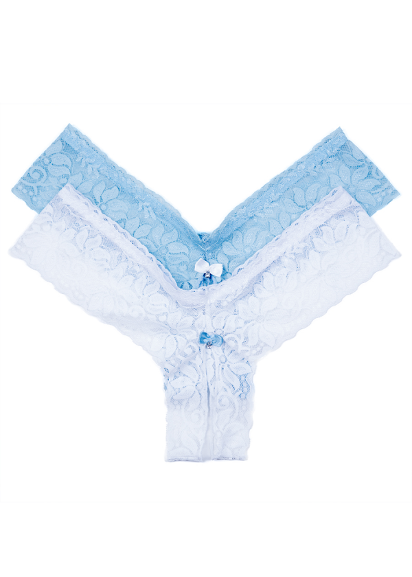 Crotchless lace tanga with bow and gem detail.