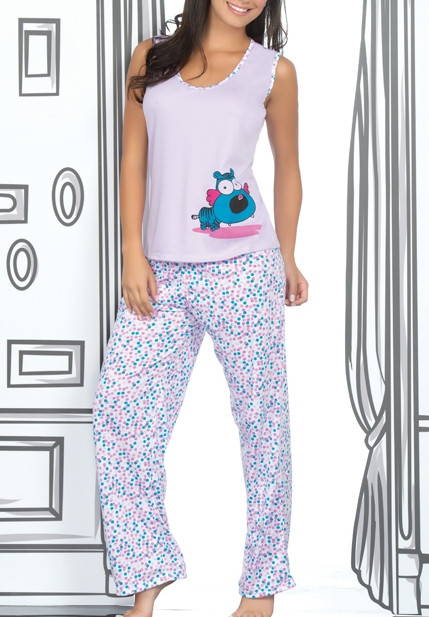 Two-piece pajamas made ??of a soft and comfortable cotton perfect for bed time, blouse tank style with contrasting biases and youthful print on the front, long pants patterned with tiny color polka dots.